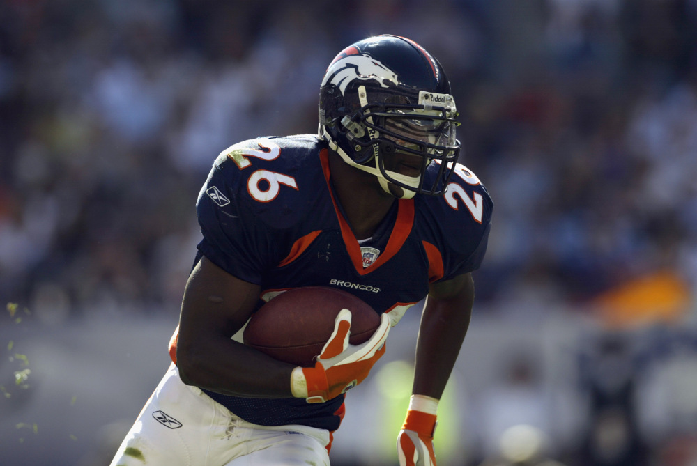 DENVER - SEPTEMBER 22: Running back Clinton Portis #26 of the Denver Broncos runs with the ball during the NFL game against the Buffalo Bills on September 22, 2002, at Mile High Stadium in Denver, Colorado. The Broncos won 28-23. (Photo by Brian Bahr/Getty Images)